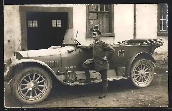 Foto-AK Auto Benz 18 /45 (1914), Soldat in Uniform mit einem Fuss auf dem Trittbrett des KFZ, Beifahrerseite