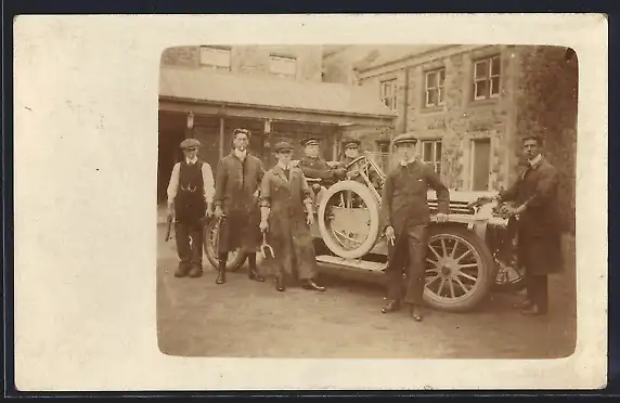 Foto-AK Auto auf einem Innenhof, davor KFZ-Monteure