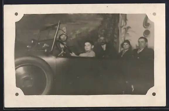 Foto-AK Auto in einer Studiokulisse, junger Knabe am Steuer