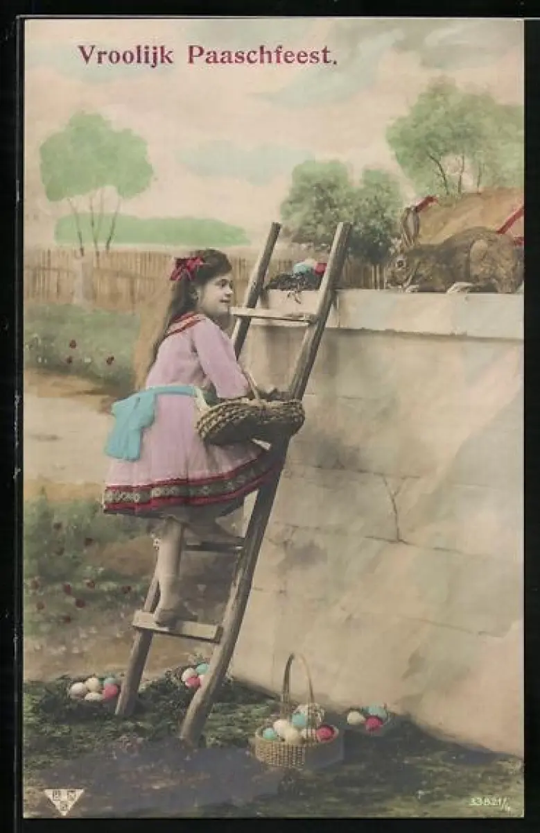 Foto-AK BNK Nr. 33821/4: Mädchen auf Leiter mit Osterhasen, Ostergruss