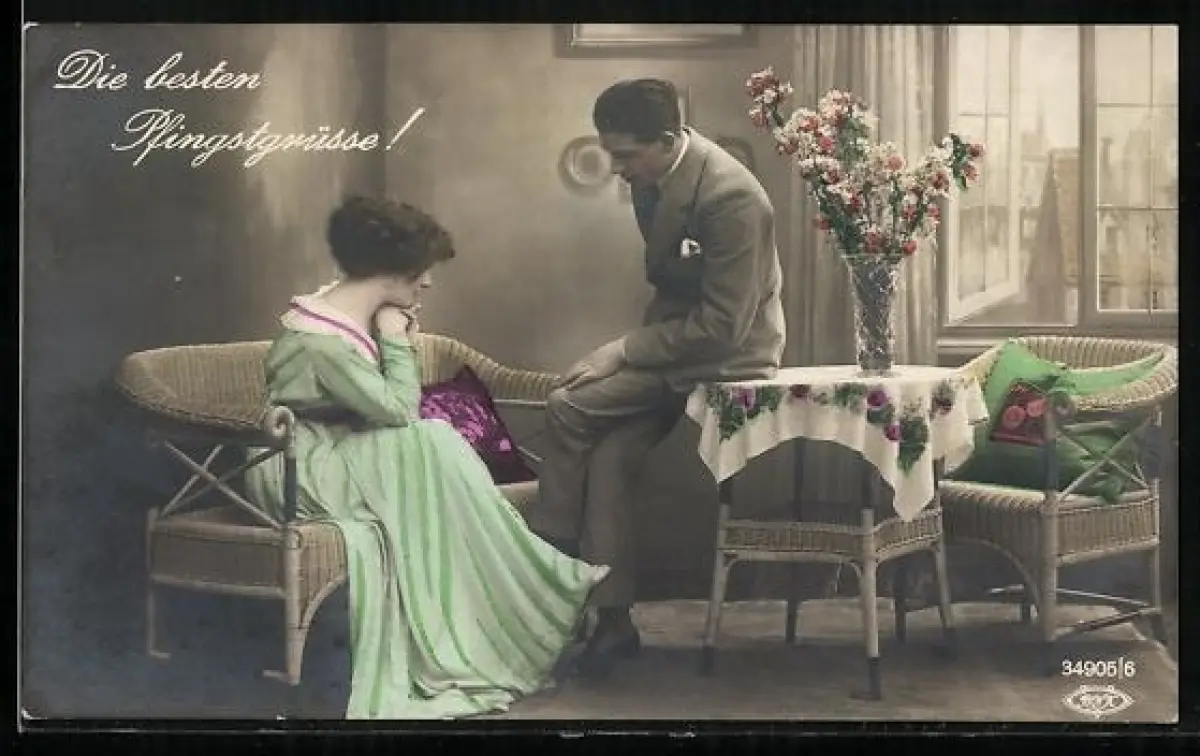 Foto-AK BNK Nr. 34905/6: Eleganter Herr bei einer Dame, Pfingstgruss