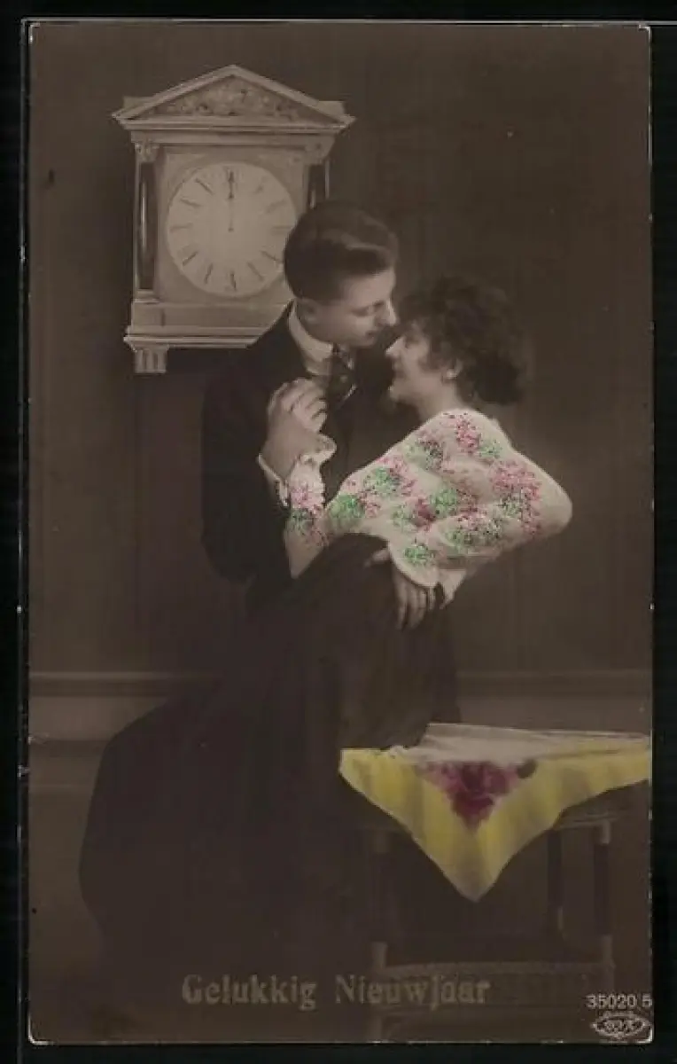 Foto-AK BNK Nr. 35020/5: Liebespaar vor einer Uhr, Neujahrsgruss