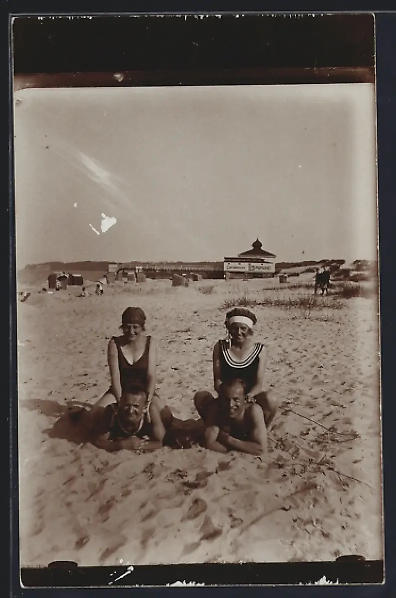 Foto-AK Baabe, Zwei Paare in Badeanzügen am Strand ca. 1925