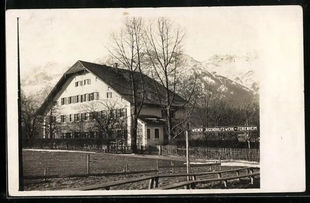 Foto-AK Bad Goisern, Wiener Jugendhilfswerk-Ferienheim mit Gebirgspanorama