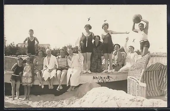Foto-AK Badegäste in Badeanzügen zusammen am Strand