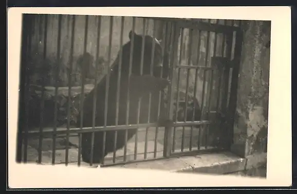 Foto-AK Bär hinter Gittern in einem kleinen Verschlag