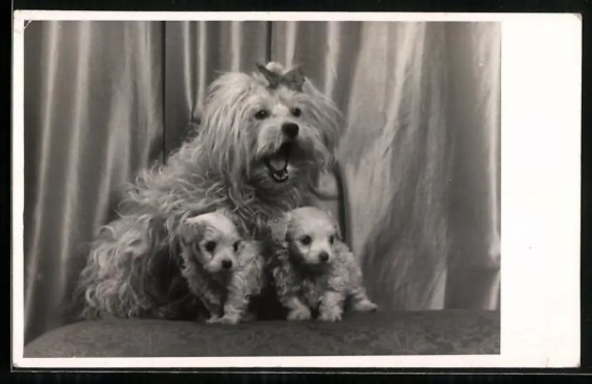Foto-AK Bellender Terrier mit Schleife und verschüchterten Jungen