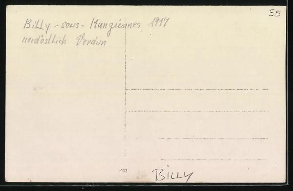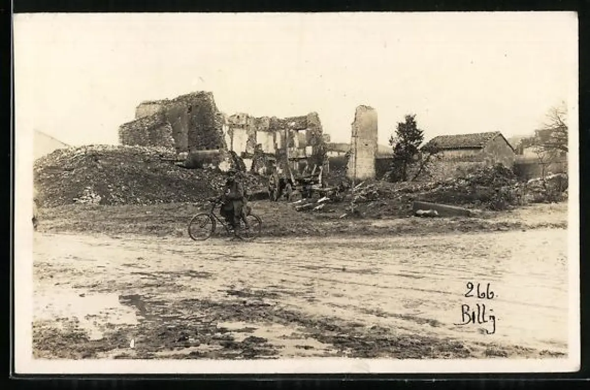 Foto-AK Billy-sous-Mangiennes, Ruines avec cycliste au premier plan