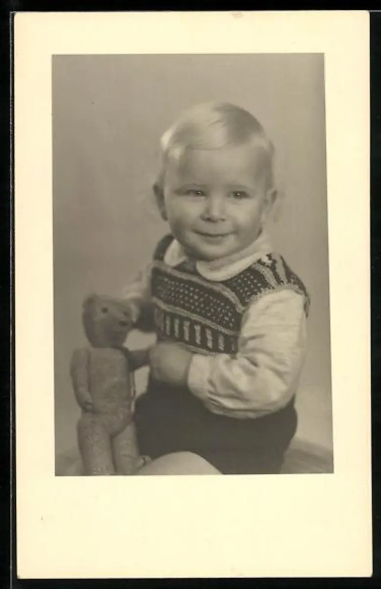 Foto-AK Blonder Junge im Pullunder mit seinem Teddybären