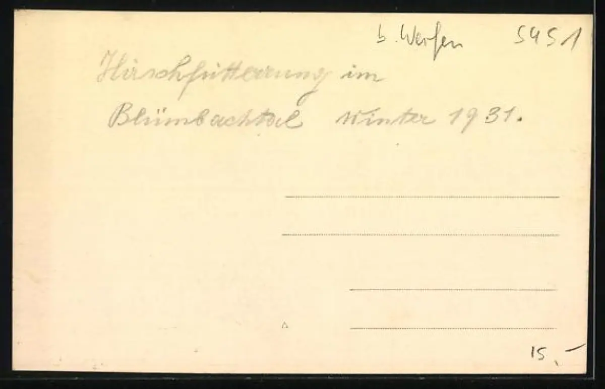 Foto-AK Blümbachtal, Soldat und Zivilistin bei der Hirschfütterung im Winter, 1931