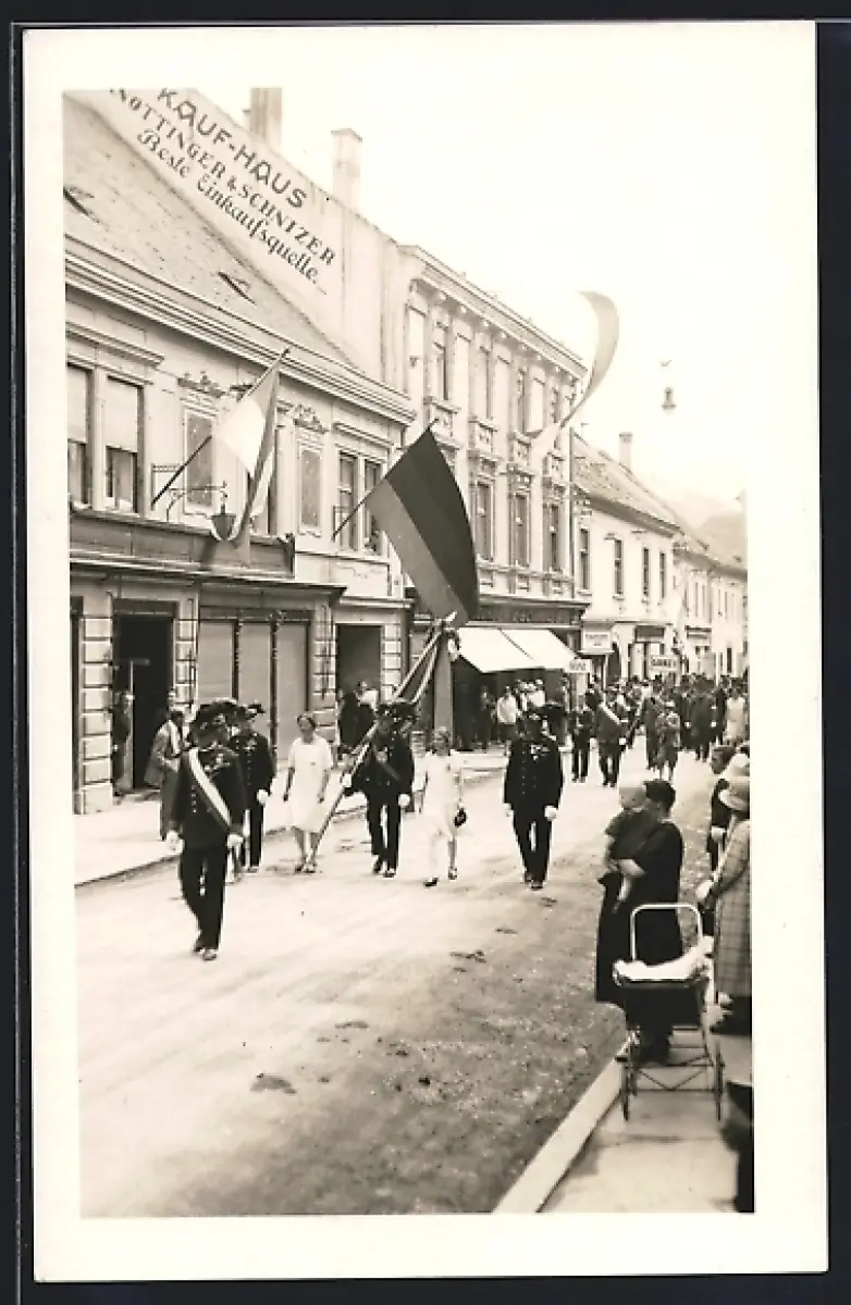 Foto-AK Bruck a. d. Mur, Strassenpartie mit Kaufhaus, Festumzug