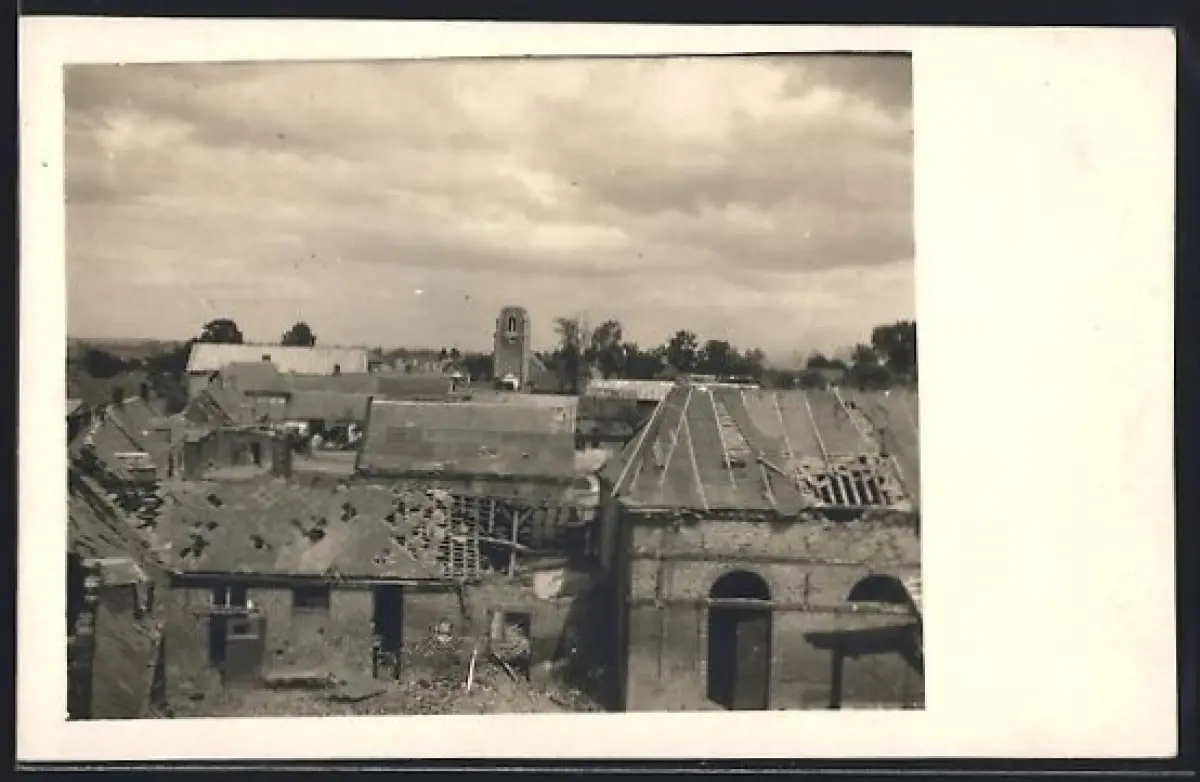 Foto-AK Courcelette, Vue des toits endommagés et de l`église en arrière-plan