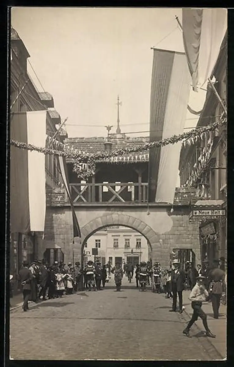 Foto-AK Crimmitschau, Stadtfest, Strassenpartie mit Torbogen / Brücke, Haus Neue Welt, Fahnen