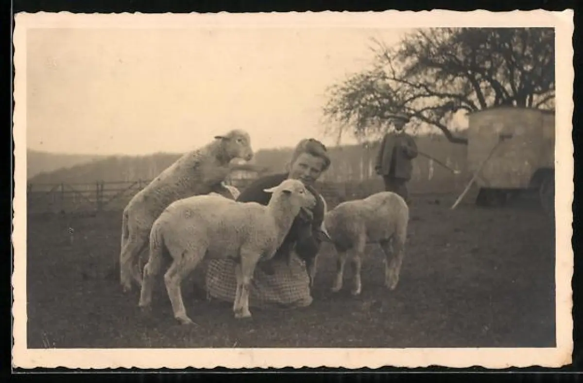 Foto-AK Dame mit Lämmern auf einer Wiese