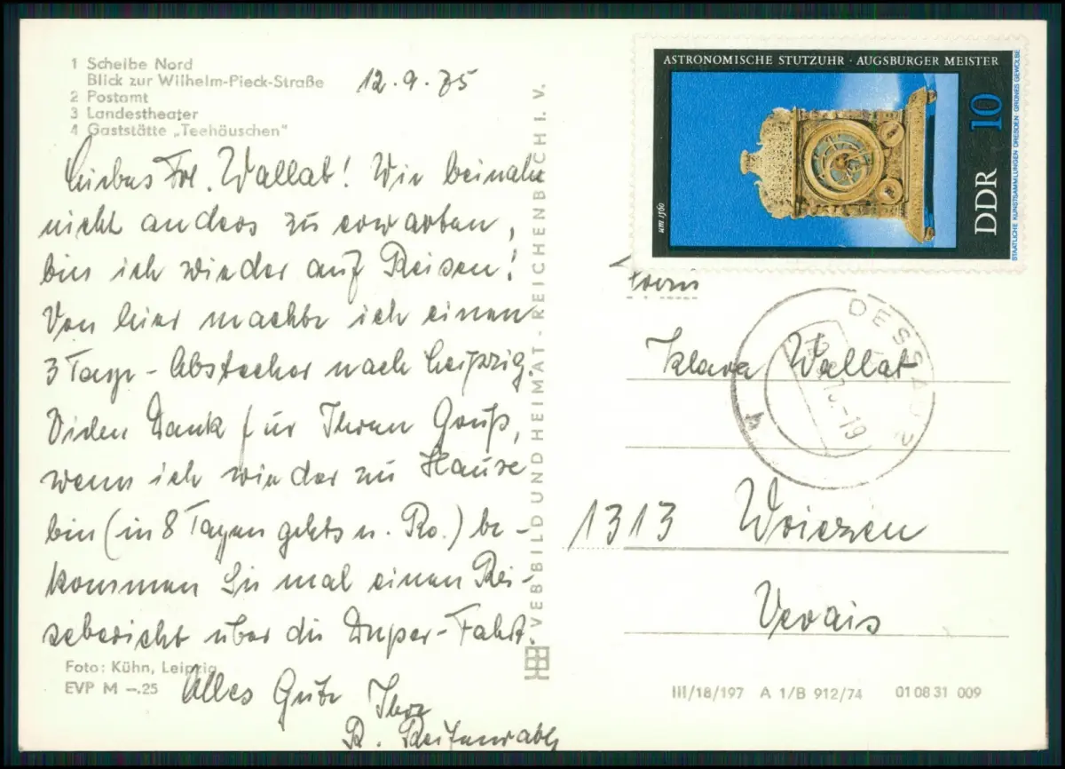 Mit handschriftlichem Text vom 12. September 1975, adressiert nach Wörlitz, frankiert mit DDR-Marke 10 Pfennig Astronomische Stutzuhr, klarer Poststempel DESSAU 1975.