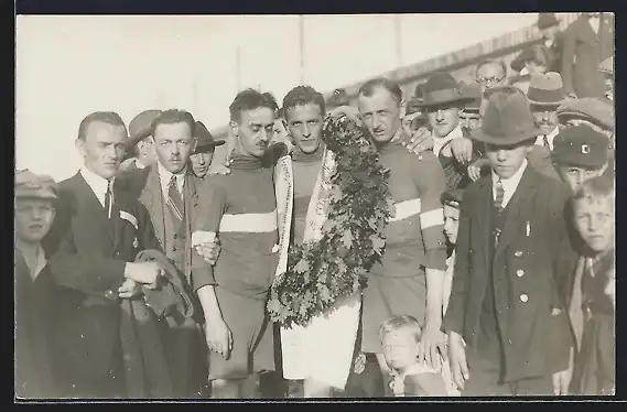 Foto-AK Die drei Erstplatzierten Radrennfahrer, der Sieger mit einem Kranz