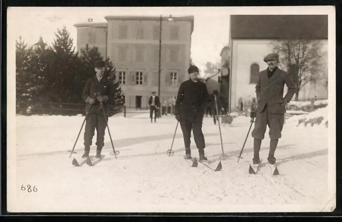 Foto-AK Drei junge Herren auf Skiern, Strassenszene