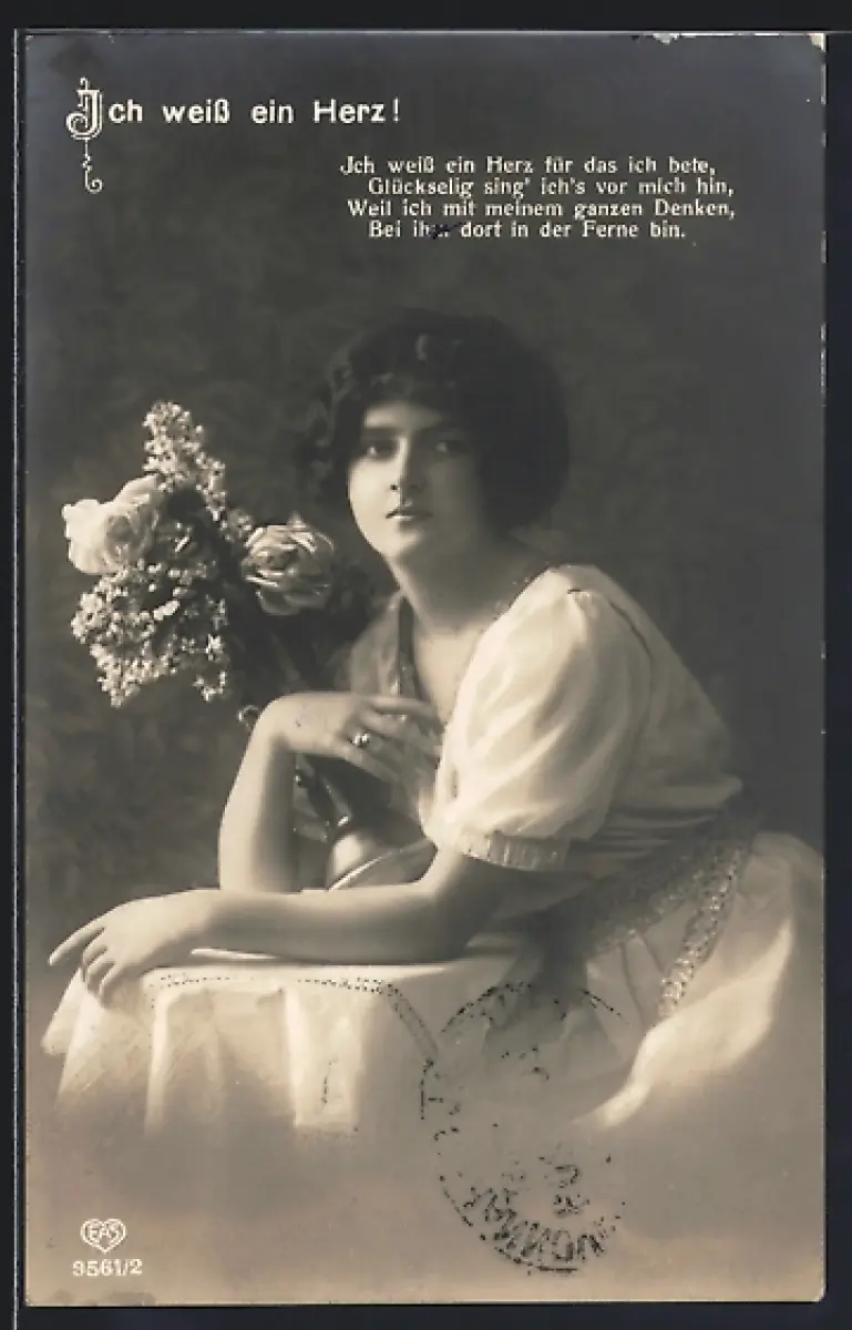 Foto-AK EAS, 9561 /2, junge Frau mit Kleid und Blumenvase, Ich weiss ein Herz!