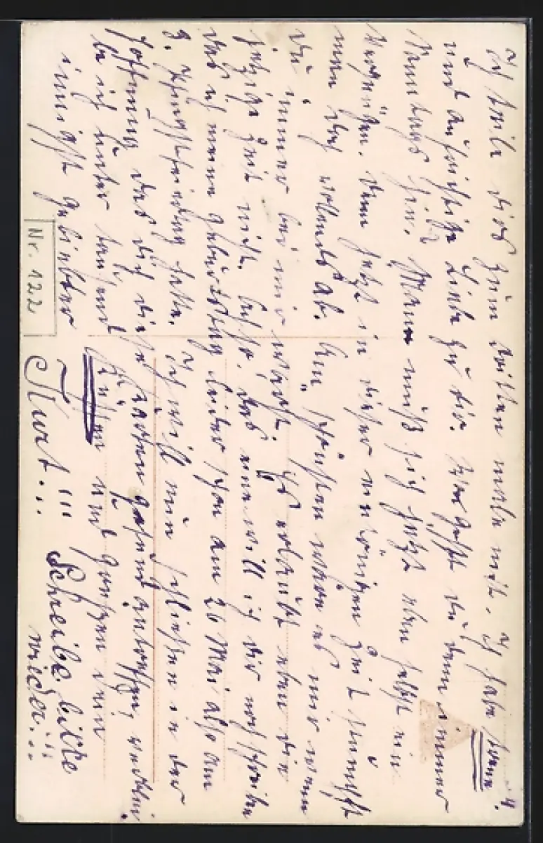 Personenbezogene Daten auf der Rückseite der Karte wurden durch blauen Textmarker unkenntlich gemacht. Die blauen Stellen sind auf die Vorderseite durchgeweicht und wirken sich negativ auf das Postkartenfoto aus