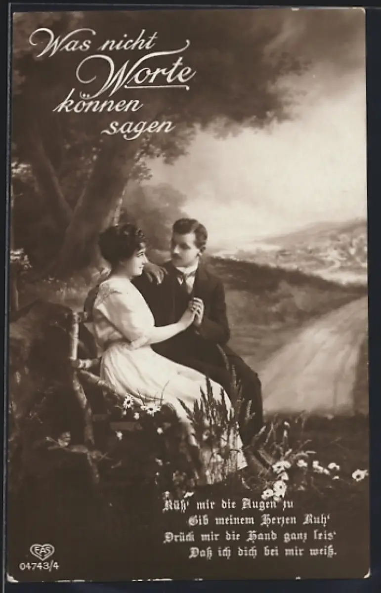 Foto-AK EAS Nr. 04743/4: Was nicht Worte können sagen, Küss` mit die Augen zu..., Liebespaar