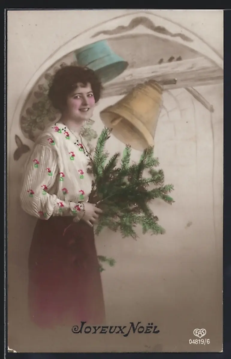 Foto-AK EAS Nr. 04819/6: Fräulein mit Tannenzweig an Glocken, Weihnachtsgruss
