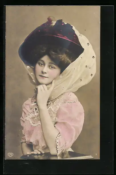 Foto-AK EAS Nr. 1511 /1: Junge Frau mit grossem Hut und Kopftuch