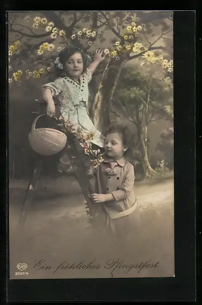 Foto-AK EAS Nr. 3297 /4: zwei Mädchen pflücken Blumen von einem Baum