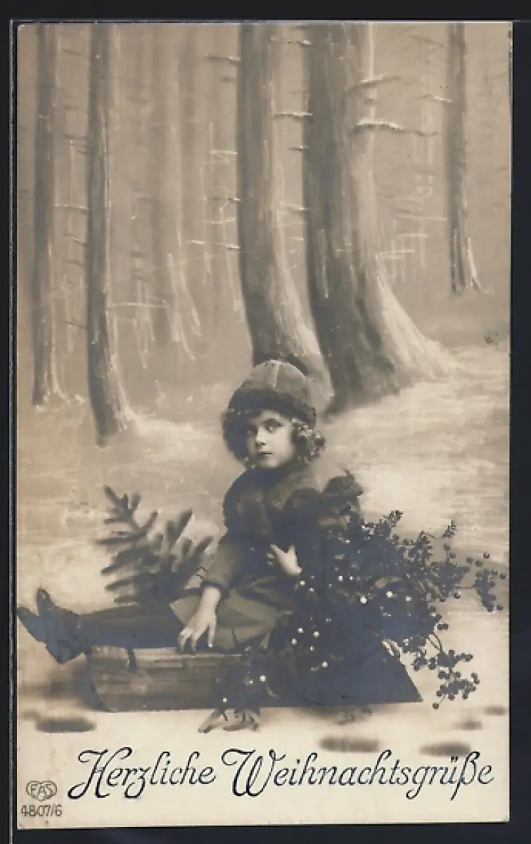 Foto-AK EAS Nr. 4807/6: Kind auf Schlitten mit Mistelzweigen, Weihnachtsgruss