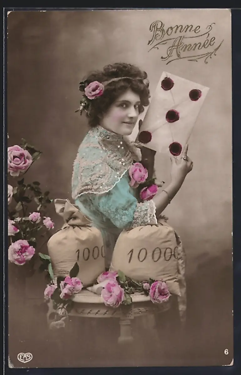 Foto-AK EAS Nr. 6: Frau mit Kuvert und Geldsäcken, Neujahrsgruss