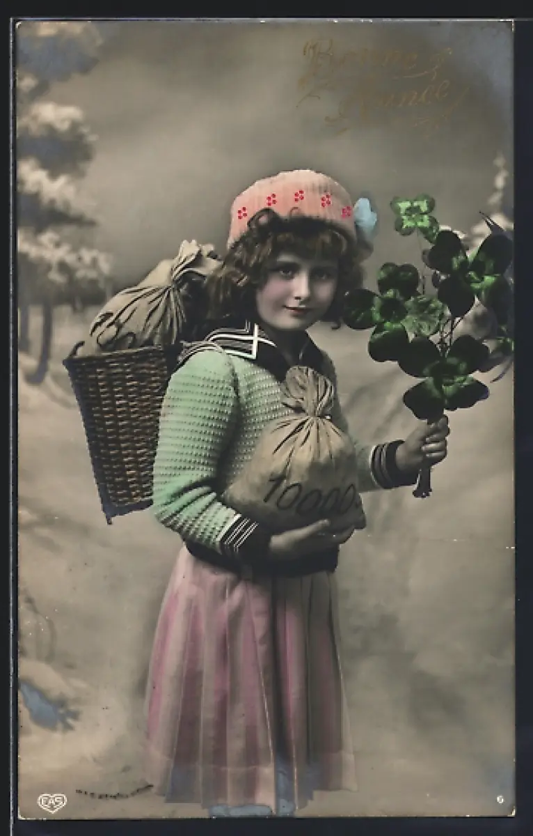 Foto-AK EAS Nr. 6: Mädchen mit Geldsäcken, Neujahrsgruss