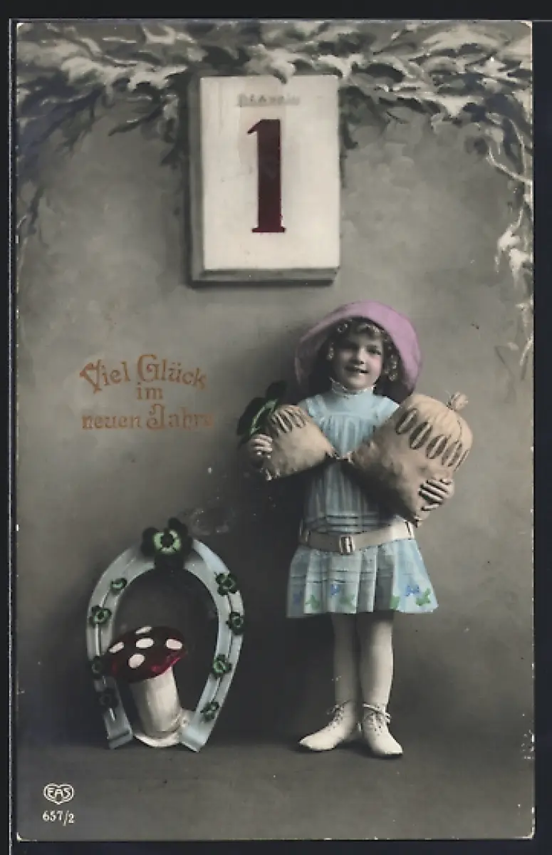 Foto-AK EAS Nr. 657/2: Kind mit Geldsäcken am Kalender, Neujahrsgruss