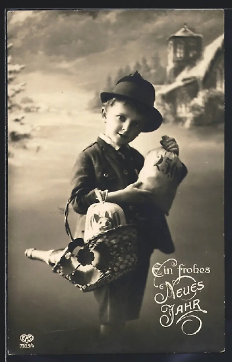 Foto-AK EAS Nr. 7303/4: Kleiner Junge mit Geldsäcken, Neujahrsgruss