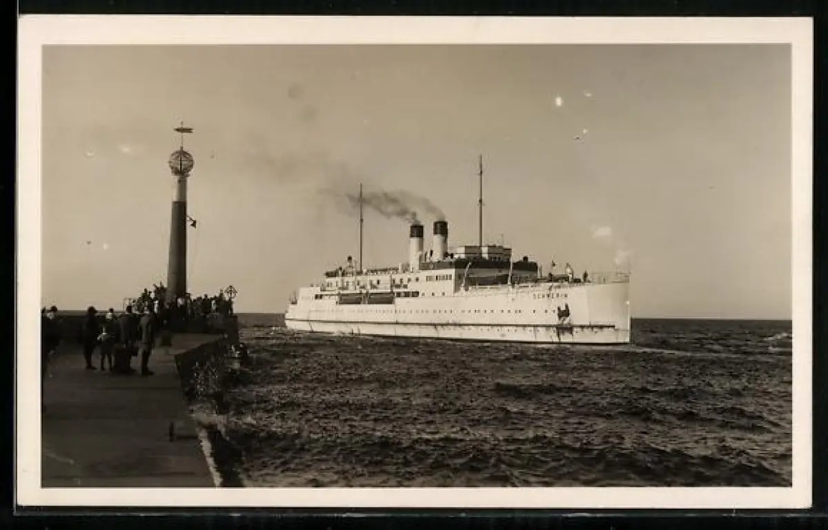 Foto-AK Eisenbahn-Fährschiff Schwerin läuft über den Achtersteven aus dem Hafen aus