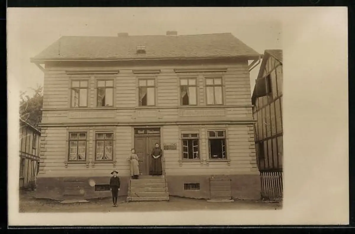 Foto-AK Eiserfeld, Handlung Adolf Reichmann, Drei Personen vor dem Geschäft