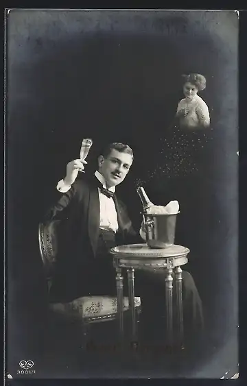 Foto-AK Elegantem Herrn mit Sektglas erscheint Geist von Frau