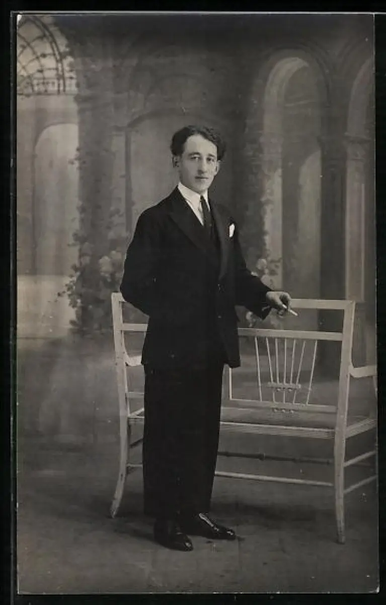 Foto-AK Eleganter Herr raucht in einer Studiokulisse