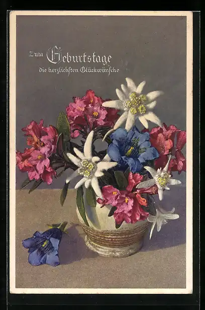Foto-AK Emanuel Gyger: Edelweiss und Alpenrosen in einer Vase