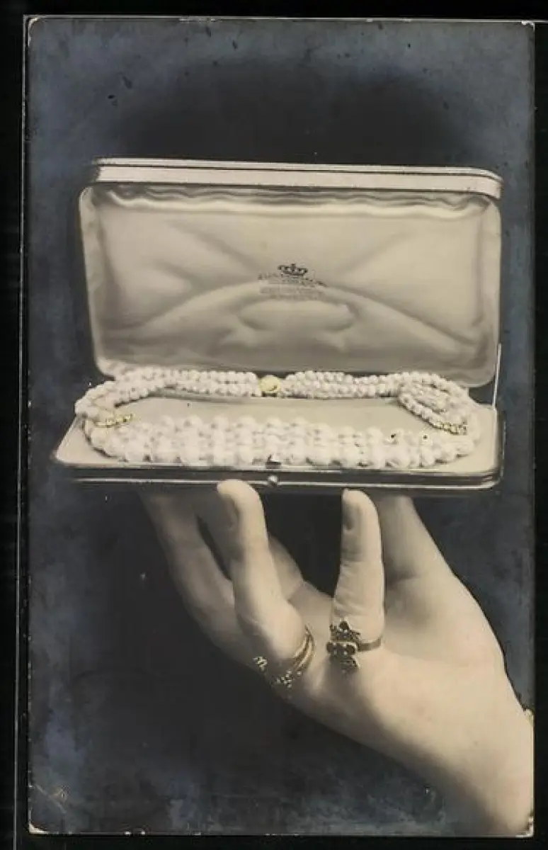 Foto-AK Etui mit Perlenkette, von ringgeschmückter Hand gehalten