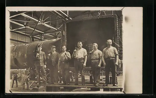 Foto-AK Fabrikarbeiter mit Hämmern vor einer Maschine während des Weltkriegs 1914