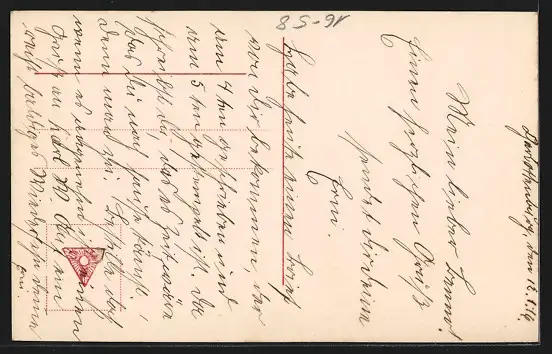 Personenbezogene Daten auf der Rückseite der Karte wurden durch blauen Textmarker unkenntlich gemacht. Die blauen Stellen sind auf die Vorderseite durchgeweicht und wirken sich negativ auf das Postkartenfoto aus