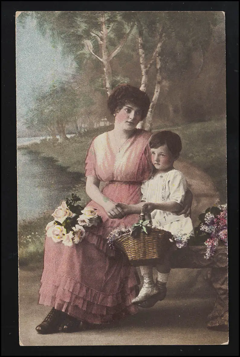 Foto AK Frauen Mutter & Tochter auf Bank innig mit Blumen, DEGGENDORF 16.5.1918