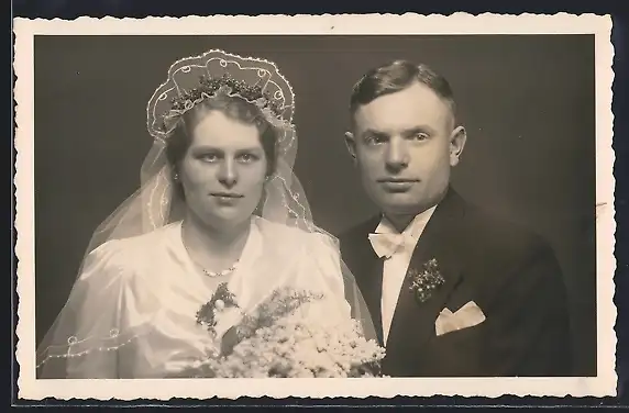 Foto-AK Frisch vermähltes Paar, Erinnerungsfoto
