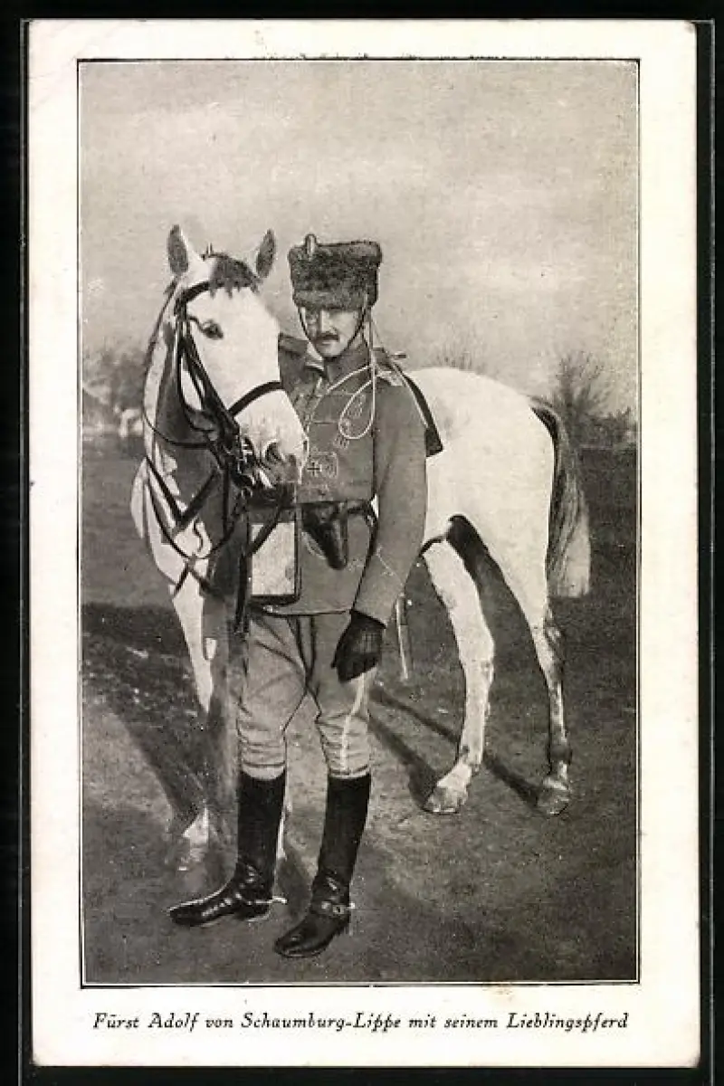 Foto-AK Fürst Adolf von Schaumburg-Lippe in Husarenuniform mit seinem Lieblingspferd