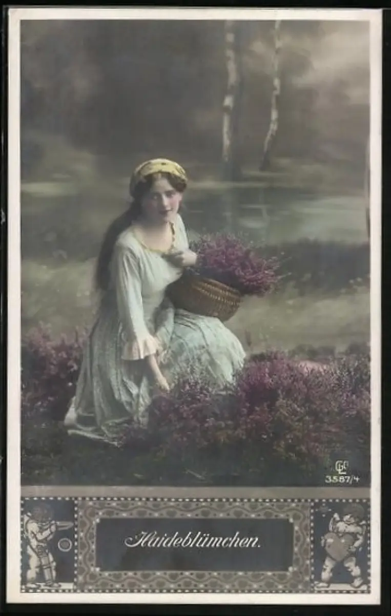 Foto-AK GL Co 3587 /4: Haideblümchen, Junge Frau pflückt Heide