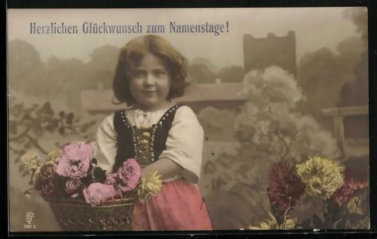 Foto-AK GL Co Nr. 1362/2: Mädchen mit Blumenkorb, Namenstag