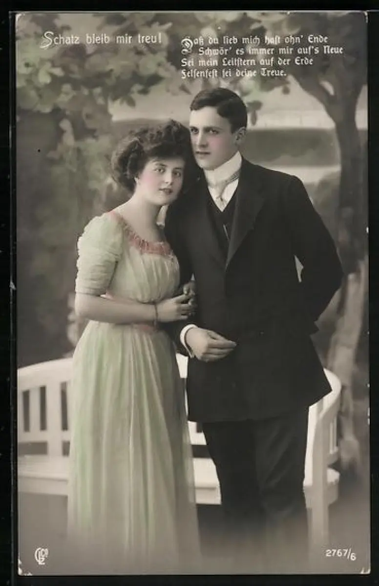 Foto-AK GL Co Nr. 2767/6: Verliebtes Paar steht vor einer Bank im Park