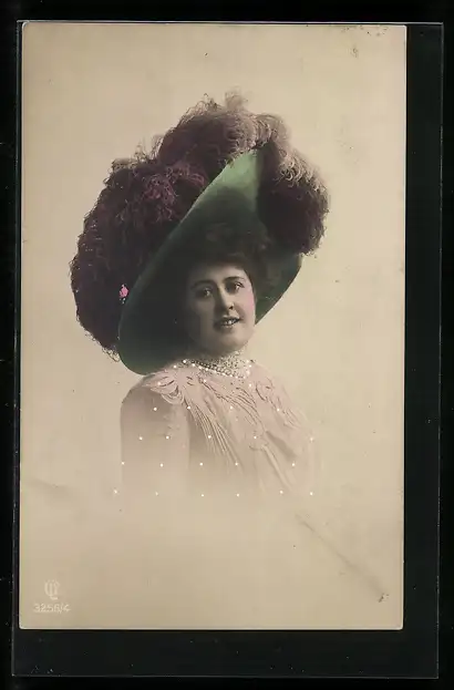 Foto-AK GL Co Nr. 3256 /4: Lächelnde junge Frau mit grossem Federhut