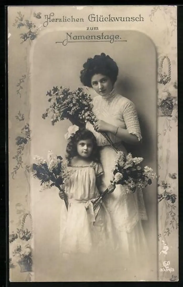 Foto-AK GL Co Nr. 3334/3: Mutter und Tochter mit blühendem Flieder, Namenstag
