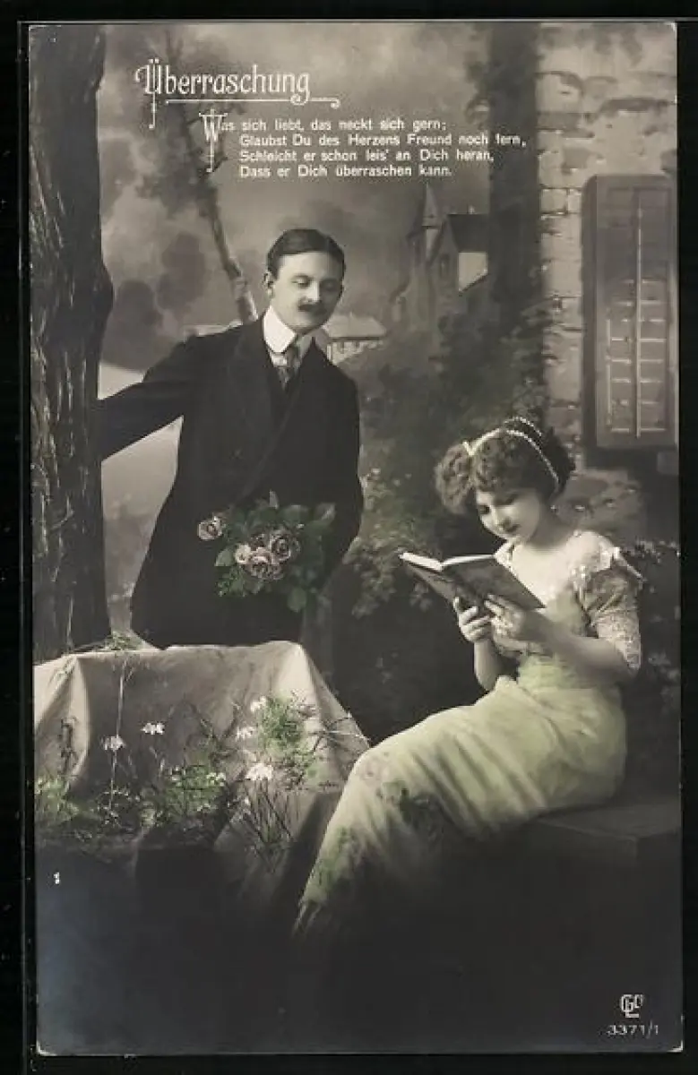 Foto-AK GL Co Nr. 3371/1: Herr mit Rosen bei lesender Frau