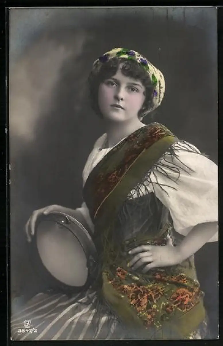 Foto-AK GL Co Nr. 3547/2: Dame mit Tamburin auf dem Schoss